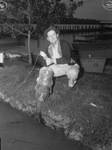 Fort Worth, Texas fireman Rea poses with a 40 pound catfish he landed at Eagle Mountain Lake. Mr. Rea is kneeling in front of several small boats tied to docks. The catfish is on the ground in front of Mr. Rea, who is wearing slacks, a sweater and a hat. A cigarette is dangling from his mouth. This photograph was publishing in the May 1, 2941 evening edition of the Star-Telegram.