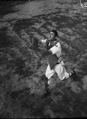 George Stancoff is a catcher for the Technical High School baseball team. Mr. Stancoff is shown in his baseball uniform and a catcher's pad on his chest. He is in the midst of running down the field, trying to catch the ball. He is looking up with both of his arms in the air. In his left hand he is wearing a baseball glove.