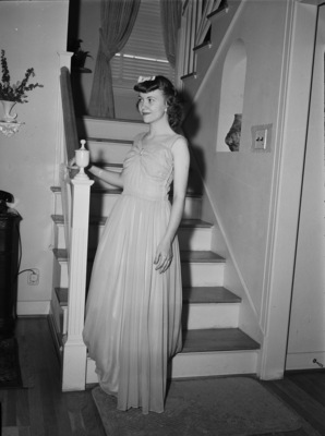 Miss Cherry Kemble, daughter of Mr. and Mrs. Will Ed Kemble, 4008 Monticello Drive, who was duchess from Arlington Heights High School to the Texas Wesleyan College May Fete. Miss Kemble will be honored at a number of graduate parties. Photograph of Miss Kemble at home, wearing a formal gown and standing at the bottom of the stairs. Published Fort Worth Star-Telegram Morning Edition May 25, 1941.