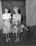 The 13th annual Panhandle Plains Dairy Show is being held in Plainview, Texas. The show exhibits both dairy cattle and dairy products and attracts crowds from all over the Plains country. Standing left to right are Myrna Dean Gaignat and Jacquelyn Wilkinson. Miss Wilkinson, of Friona, Texas, is being crowned queen of the 1941 show. She is wearing a crown of flowers, a floral print dress, and is carrying a basket of flowers. Miss Gaignat, of Tahoka, Texas, is the maid of honor. She is wearing a dress with a solid colored bodice and a floral print skirt.