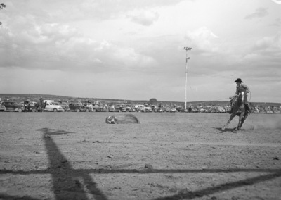 Carl Arnold, of Buckeye, Arizona, challenged the reigning world champion cowboy steer roper, Bob Crosby, at the Carlsbad Rodeo steer roping contest in New Mexico. Mr. Arnold is shown in the arena, on his horse, after the steer has been thrown and is lying on the ground. There are spectators in the background, standing next to automobiles.
