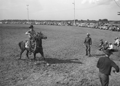 Carl Arnold, the challenger against reigning world champion Bob Crosby, gets set for his steer at the Carlsbad Rodeo steer roping contest in Carlsbad, New Mexico. He is on his horse, holding a rope. There are two unidentified people in the arena, standing in front of him and holding an outstretched rope. There are spectators and automobiles in the background.