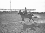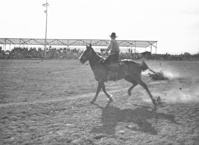 Carl Arnold after he got his steer in the Carlsbad Rodeo steer roping contest, in Carlsbad, New Mexico. He is on his horse in the arena, and is shown in the act of roping the steer, which is lying on the ground. There are spectators in the background.