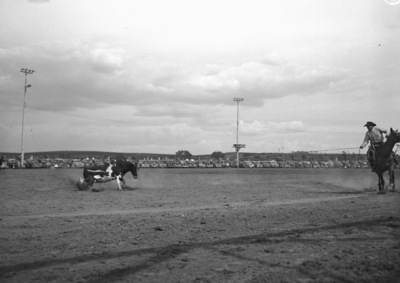 Bob Crosby, world champion cowboy steer roper, brings down his steer at the Carlsbad Rodeo steer roping contest, in Carlsbad, New Mexico. He is on his horse as he ropes the steer. There are spectators and automobiles in the background.