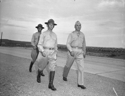 Three men wearing military uniforms walking next to a road. In the distance is a large group of soldiers marching.