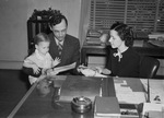 Among the first and youngest purchasers of a defense bond in Fort Worth, Texas, was Charles Oliver Bubar, 1-year-old son of Mr. and Mrs. Donald C. Bubar 4433 Foard Street. Charles is sitting on his father's lap as Miss Florence Scott, assistant secretary, delivers a $25 bond at the Mutual Building and Loan Association office. They are sitting at a desk. On the desk are various documents and an ashtray. Mr. Bubar is wearing a suit and Miss Scott is wearing a dress.