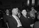 Two directors of the Texas Real Estate Association who are taking an active part in the annual convention of the organization in Mineral Wells, Texas. They are Ted R. Logan, left, of San Angelo, Texas, and Tom H. Jackson of Waco, Texas. They are sitting next to each other, both wearing suits and eyeglasses. There are unidentified people sitting behind them.