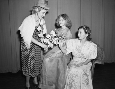 Students and members of the Parent-Teacher Association at South Fort Worth School will present three one-act plays on May 9 at the school auditorium. Three of the cast members, left to right, are Mrs. Olyn McClister, Jean Ewers and Mrs. M. T. Nelson. "Thursday at Home," "Singapore Spider" and "Things We See on the Stage" will be included on the program, sponsored by the Parent-Teacher Association. The actors are rehearsing on stage and are all in costume. Mrs. McClister is wearing a hat with a flower, a scarf and a striped dress. She is holding flowers. Miss Ewers and Mrs. Nelson are sitting beside her. Both are wearing dresses.