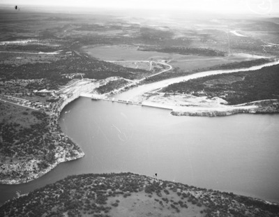 Aerial view at Possum Kingdom dam looking downstream from the newly formed lake was taken Saturday, May 3, when water at the dam was 119 feet deep. Monday, May 5, the lake was 135 feet deep at the dam and was pouring over the concrete top of the structure six feet and eight inches deep. Published in the Fort Worth Star-Telegram evening, May 5, 1941.