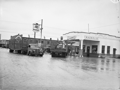 Floods plagues many West Texas communities over the weekend. Water covered the streets of Munday. This picture of trucks drawn up on a flooded thoroughfare in front of a gas station was taken within a block of the Munday city hall. Published in the Fort Worth Star-Telegram evening edition, May 5, 1941.