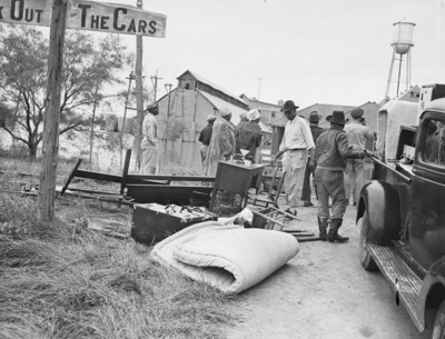 Scenes of flood damage around Seymour (Tex.) Oil Mill. Several residents stand on dry land looking over the flooded area around Seymour Oil Mill. There are items salvaged piled up on the street like mattress, suitcases, chairs and small table. The truck on the right has furniture and other items packed in the truck bed.