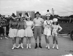 Parade of farmers and business men in Decatur Texas. The parade included H. Ca. MCurdy (third from right) originator of the parade plus drum majorettes from Decatur High School (left to right,) Elizabeth Renshaw, Iris McDaniel, Margaret Usry, H. Cal McCurdy, Martha Belle Renshaw, and Mascot Constance Van Meter. The you women are wearing their majorette uniforms. Mr. McCurdy is wearing short pants with black socks and shoes, short with bow tie and a hat. A cigar is in his mouth. An oil tank feature prominently in the background. This photograph was published in the May 4, 1941 morning edition of the Star-Telegram.