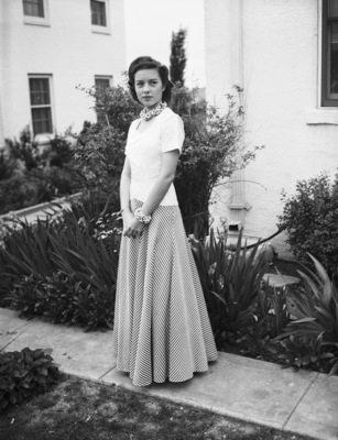 Linda Geren, daughter of Mr. and Mrs. Preston Geren, 2040 Windsor Place, recently represented Texas A. & M. College alumni from Fort Worth a the College's Cotton Ball. Ms. Geren is wearing a long dress with necklace and matching bracelet. She is standing amidst a variety of plantings. This photograph appeared in the May 7, 1941 morning edition of the Star-Telegram.