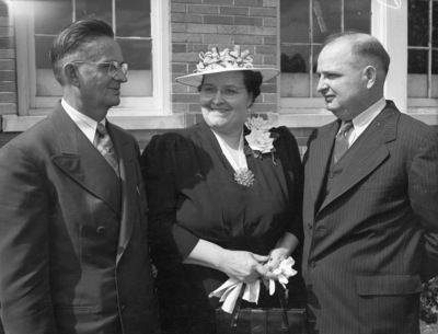 The Everman, Texas, Homecoming is being held Sunday afternoon. New officers are being elected and re-elected at the meeting. Standing left to right are the re-elected officers of the Homecoming Association, J. Dow Johnson, Mrs. Grace Stephenson, and J. Lewis Stephenson. Mr. Johnson is the vice president. He is dressed in a double breasted suit. Mrs. Stephenson is the president. She is wearing a hat, dress, brooch, and a corsage. Mr. Stephenson is the secretary. He is dressed in a three piece pinstripe suit.