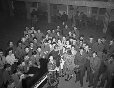 Students from Howard Payne College visited Camp Bowie and attended a party at the Service Center. Major General Claude V. Birkhead, 36th Division commander, dropped in to welcome the students. He is standing in the center of a crowd of students and soldiers who are gathered around a piano.