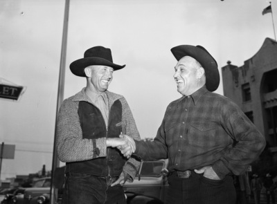 Carl Arnold, left, shaking hands with Bob Crosby, reigning world champion cowboy steer roper, after losing to him at the world's championship steer roping contest at Carlsbad, New Mexico. Mr. Crosby successfully defended his title by roping a dozen Mexican steers in a total time of 578.8 seconds. Both men are standing outside, and are wearing shirts, trousers and cowboy hats. There are automobiles and a building in the background.