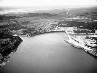 Aerial view at Possum Kingdom dam looking downstream from the newly formed lake was taken Saturday, May 3, when water at the dam was 119 feet deep. Monday, May 5, the lake was 135 feet deep at the dam and was pouring over the concrete top of the structure six feet and eight inches deep. Published in the Fort Worth Star-Telegram evening, May 5, 1941.