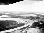 Aerial view shows a section of the Brazos river over Southbend and up clear fork, overflowing its banks, which are surrounded by houses and farm land.