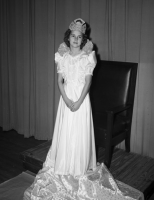 Vanda Nabors, 11, who will be crowned May Queen of Polytechnic Elementary School at a program in the school auditorium at 7:30 p.m. Friday. She is seen wearing a a few necklaces, a long light-colored evening gown with bows and a crown. She is standing in front of a chair.