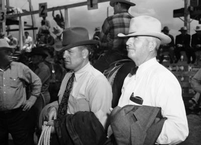 John Lindsey, left, of Wichita Falls, Texas, rodeo clown, and Jim Minnick, of Crowell, Texas, who judges stock horses at the Fort Worth Rodeo, were spectators at the Carlsbad Rodeo steer roping contest in New Mexico. They are standing outside, among other attendees, and are both wearing long-sleeve collared shirts and cowboy hats. They are holding coats. Mr. Lindsey is holding a rope in one hand.