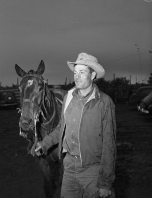 Jim Espy, of Fort Davis, Texas, who won the jackpot roping contest at the Carlsbad Rodeo in Carlsbad, New Mexico. He is standing outside next to his horse, and is wearing a cowboy hat, shirt, trousers and a coat. There are automobiles in the background.