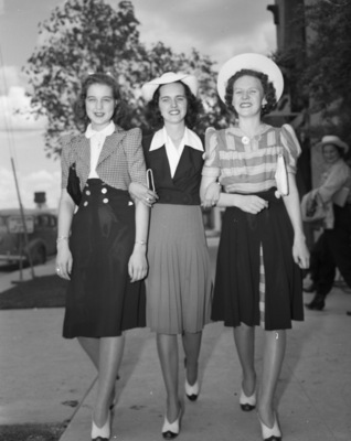 Standing left to right are Virginia Crosby, Roberta Crosby and Joyce Naramore, all of Roswell, New Mexico, in attendance at the Carlsbad Rodeo, in Carlsbad, New Mexico. Virginia is the niece of Bob Crosby, who competed in, and won, the Carlsbad Rodeo world championship steer roping contest. Roberta is his daughter. All three are standing outside, with their arms linked. They are wearing blouses and skirts, and Roberta and Miss Naramore are wearing hats. They are all wearing matching shoes.