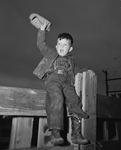 Bob Crosby, Junior, ("Screw" Crosby) 4, who cheered for his father, Bob Crosby, world champion cowboy steer roper, at the Carlsbad Rodeo at Carlsbad, New Mexico. Bob Jr. is sitting on a wooden fence, wearing a checkered shirt, trousers, coat and cowboy boots, and is holding a cowboy hat.