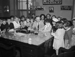 These 37 boys and girls, first grade pupils at South Hi-Mount School, were customers at the post office as each purchased postal savings stamps to be used later, when they have $25 worth, in purchase of a defense bond. Postmaster Henry D. Young was the salesman. Postmaster Young is sitting at a desk and is surrounded by the children. He is wearing a suit. On the desk is a pen and ink stand, a telephone and various documents.