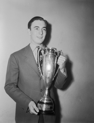 George Edward Stephens, senior at Paschal High School, shown with the loving cup he won in the state contest in senior declamation, the first time in 35 years a student at the school won the state contest. He is standing in front of a bare wall and wearing a suit.