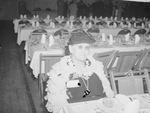Mrs. A. A. Clarke, 88, attended the banquet of the Albany, Texas Chamber of Commerce. She has lived in Albany, Texas since 1877. She is sitting at a table and is wearing a dress, shawl, hat and eyeglasses. Behind her are rows of tables.