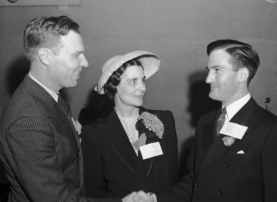 Paul Ord, manager of Mineral Wells, Texas Chamber of Commerce, greeting his friend, J. Carter King Junior, past president of the Albany, Texas Chamber of Commerce, and Mrs. Mary Whatley Dunbar, Palo Pinto, Texas publisher. Mr. Ord and Mr. King are wearing suits and are shaking hands. Mrs. Dunbar is wearing a blouse, blazer and hat.