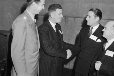 Standing left to right are James Brannon, C. M. O'Brian, Joe E. Clarke and J. C. Cozby, all of whom attended the Albany, Texas Chamber of Commerce banquet. They are all wearing suits and Mr. Clarke is wearing eyeglasses. He and Mr. O'Brian are shaking hands.