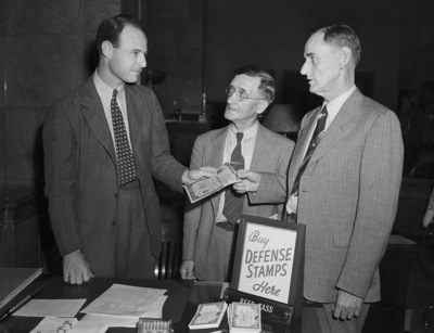 Reed Saas, left, manager of the business development of Fort Worth National Bank, shown handing over a Series F bond to L. E. Eager, right, business representative of Painters Local No. 318, who purchased it for his union, while Thomas Walker, center, secretary of Operative Plasterers and Cement Finishers Local No. 34, looks on. They are all wearing suits and standing behind a desk. On the desk is a sign that reads "Buy Defense Stamps Here." Mr. Walker is also secretary of the Building Trades Council.