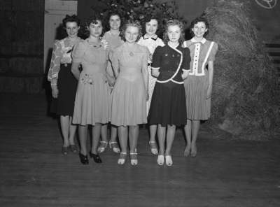 The 13th annual Panhandle Plains Dairy Show is being held in Plainview, Texas. Some of the out-of-town visitors were, left to right, on the front row, Estella Wimmer, Georgea Cox and Frances Helm. Along the back row are, Jacquelyn Wilkerson, Dorothy Baley, Mary Lou Scoggin, and Rhudean Talley. The women are standing inside a barn, posed in front of a haystack. Miss Wilkerson is wearing a long-sleeve blouse and a skirt. The other women are wearing dresses.