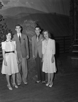 The 13th annual Panhandle Plains Dairy Show is being held in Plainview, Texas. Many West Texas young people are taking part in the social functions. Standing left to right are two out-of-town "princesses" and their "knights," Miss Mary Lou Scoggin, Cullen Chapman, Charles Craig, and Miss Rosalyn Watson. Miss Scoggin, of Lubbock, Texas, is wearing a polka-dot dress with a belt around her waist. Mr. Chapman is dressed in a suit with a pocket square. Mr. Craig is dressed in a dark suit with a handkerchief in the pocket. Miss Watson, of Lubbock, Texas, is wearing a floral print dress with a long blazer. The group is standing in front of a haystack.