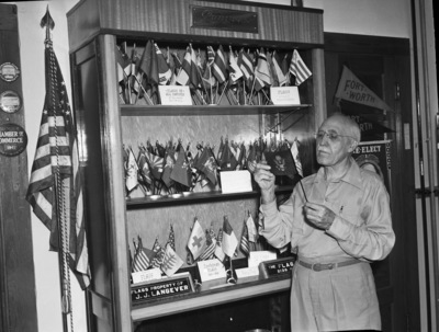 J. J. Langever with his collection of miniature flags.