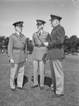 The Reserve Officers' Training Corps of the Fort Worth Public Schools underwent annual Federal inspection Thursday, May 8, on the campus of Amon Carter Riverside High School. The inspecting officers and the head of the Fort Worth ROTC, left to right, are Colonel Theodore K. Spencer, assistant civilian components officer, Eighth Corps Area, San Antonio; Lieutenant Colonel R. K. Whitson, professor of military science and tactics for the public schools, and Lieutenant Colonel M. B. Oliver, professor of military science and tactics at North Texas Agricultural College, Arlington. The officers are in conversation, standing in the parade grounds. Published in the Fort Worth Star-Telegram evening edition, May 8, 1941.