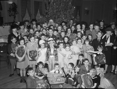 All-Church Home children shown at the Lions Club luncheon where they were honor guests. The children are crowded around a Santa Claus that is standing at the very back of the group, in front of a Christmas tree. Many of the children are holding presents, as well as fruits, candies and nuts. On either side of the group of children are a few older women that are wearing dark, long dresses and hats. Some of the children are sitting on the floor in the foreground, playing with toy wagons. One of the children is dressed like Uncle Sam.
