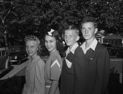 These students were winners of Good Citizenship Medals annually presented by the chapters of the Daughters of the American Revolution to a boy and girl in each of the junior high schools. This group received medals from the Fort Worth Chapter. They are, left to right, Billie Jo Dysart (Amon Carter Riverside Junior High), Mary Jo Halsell (W. C. Stripling Junior High), Billy Hogue (Amon Carter Riverside) and Huck Newberry (W. C. Stripling). The two boys are wearing suits and the girls are wearing dresses. Mary Jo has a bow in her hair. They are standing outside and behind them are parked cars, houses and trees.