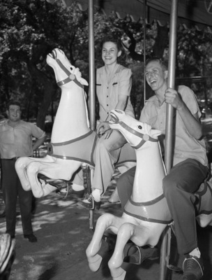 Weatherford College annual freshman day picnic attended by 50 freshman was held at Forest Park Thursday afternoon. Miss Monah Neal and Darwin Shipman, Weatherford College freshman, are riding the carousel. They are holding hands and laughing. There is an unidentified man, standing in the background. Published in the Fort Worth Star-Telegram morning edition, May 9, 1941.