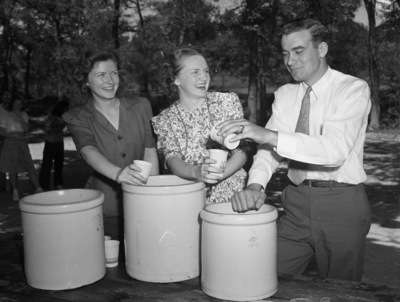 Weatherford College annual freshman day picnic attended by 50 freshman was held at Forest Park Thursday afternoon. Howard Jones, class president, dips out a drink for Misses Carol Frisher, left, and Florence Gwalthney, class secretary. Jones is wearing trousers, light colored long sleeve button down shirt, necktie and belt. Fisher is wearing a dark colored dress and Gwalthney is wearing a floral dress. All three are smiling and standing behind a table with three crockeries holding lemonade. Dipping deep to the 10 gallons of lemonade didn't last long. The more than 50 collegians spent a lively afternoon hiking, playing games, visiting the zoo, roller skating and riding the so-called "kid" amusements. Published in the Fort Worth Star-Telegram evening edition, May 9, 1941.