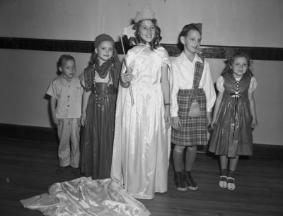 De Zavala School play cast. Left to right, Wayne Ferguson, Barbara Wayne Robbins, Betty Maloy, Jack Field, Mollie Joan Lassitere. The Queen and four performers who will be seen in a May fete at Dezavala School. Three hundred children will execute native dances of many lands. The children stand and pose for a picture. Published on May 9, 1941.