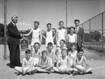 Riverside Elementary School students, teachers and administrators. Left to right, front row, Kern Medley, H. C. Queen, Bill Jones, Bill Newby. Second row, Bill Dodson, Jimmy West, George Weatherly and James Houston. Back row, Assistant Superintendent B. C. Shulkey presenting pennant to Willie B. Carrell, Benny Ralls, Billy Lloyd, Joe Pearce and Coach J. L. Blair.