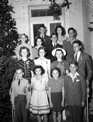 Image shows These students were winners of Good Citizenship Medals annually presented by the chapters of the Daughters of the American Revolution to a boy and girl in each of the junior high schools. This group received medals from the Mary Isham Keith Chapter. They are, left to right, on the front row, James Garrison (J. P. Elder Junior High), Helen Grace Whipple (Meadowbrook Junior High), Mary Emma Houlihan (Handley Junior High) and William Lee Andrews (Diamond Hill Junior High); second row, Polly Hampton (J. P. Elder), Betty Jo Gray (Diamond Hill), Nancy Hartman (McLean Junior High) and Baird Wonsey (McLean); third row, John Ervin McDonald (Rosemont Junior High), Patsy Curry (Jennings Avenue Junior High), James Pinto (Meadowbrook) and Earl York (Handley); back row, Richard Jones (Jennings) and Sarah Bell Clayton (Rosemont). The students are standing on the front steps of a building, wearing formal clothing. Published in the Fort Worth Star-Telegram evening edition May 13, 1941.