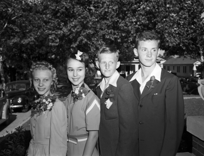 Image shows These students were winners of Good Citizenship Medals annually presented by the chapters of the Daughters of the American Revolution to a boy and girl in each of the junior high schools. This group received medals from the Fort Worth Chapter. They are, left to right, Billie Jo Dysart (Amon Carter Riverside Junior High), Mary Jo Halsell (W. C. Stripling Junior High), Billy Hogue (Amon Carter Riverside) and Huck Newberry (W. C. Stripling). The two boys are wearing suits and the girls are wearing dresses. Mary Jo has a bow in her hair. They are standing outside and behind them are parked cars, houses and trees. Published in the Fort Worth Star-Telegram evening edition May 13, 1941.