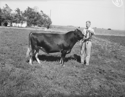 The 13th annual Panhandle Plains Dairy Show is being held in Plainview, Texas. The show exhibits both dairy cattle and dairy products and attracts crowds from all over the Plains country. "Dairylike Blonde Roseboy," is a 20-month-old bull. He is the first prize senior calf, junior champion bull, and grand champion Jersey bull of the show. I. C. Sprague, of Tulia, Texas, is shown standing by the halter, smoking a cigar. Mr. Sprague is wearing a dress shirt, necktie, and trousers.