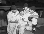Huddled together in the dugout at LaGrave Field, left to right, Fort Worth Cats baseball players Bill Skelley, Charley English, Ford Garrison and Lou Vezilich. The players are sitting close together, holding each other's shoulders and smiling. All of them are wearing matching Fort Worth Cats baseball uniforms and dark baseball caps. Vezilich is also wearing a baseball glove on his left hand.