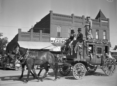Mansfield Pioneer Celebreation. Driving old time coach McKnights were in were Charley Sears, left, very old African American man; Mary Ann Farr and Charley's son, Andy. Standing on top of coach is Roy Watson, Mansfield grain dealer.