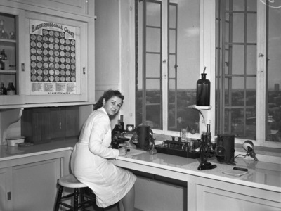 National Hospital Day. Miss Blanche Greenlee, medical technologist, shown at work in laboratory at Saint Joseph's Hospital.