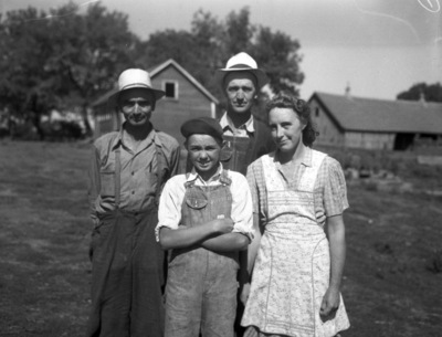 The Petersen family runs feedlots at Correctionville, Iowa, in the Corn Belt region. In front is Walter Petersen, 13, and his mother, Mrs. John Petersen. In the rear is George Neal, left, a neighbor of the Petersens, and John Petersen. They are standing outdoors. In the background are barns and trees. Walter is wearing a long-sleeve shirt, overalls and a hat. Mrs. Peterson is wearing a dress. Mr. Neal is wearing a long-sleeve, collared shirt, hat, trousers and suspenders. Mr. Petersen is wearing a hat, collared shirt, overalls and a coat.